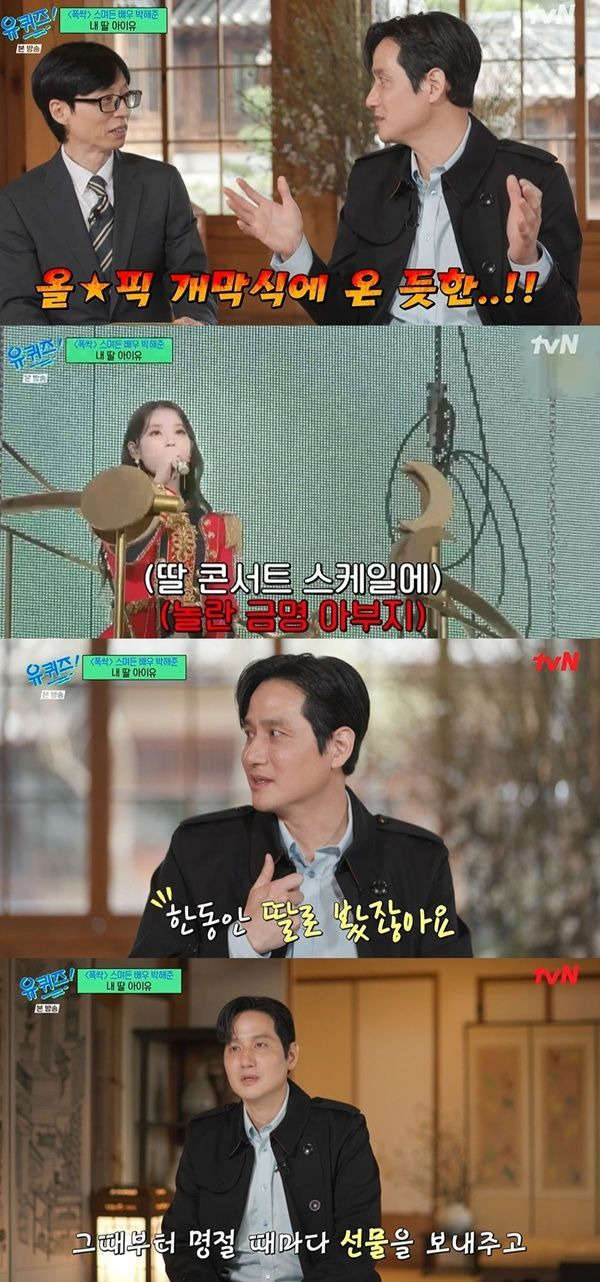 이날 박해준은 "20년 전 강산애 콘서트를 보고 이후에 (아이유) 콘서트를 처음 갔다. 다른 차원이더라. 올림픽 개막식에 온 듯한"이라고 말했다.