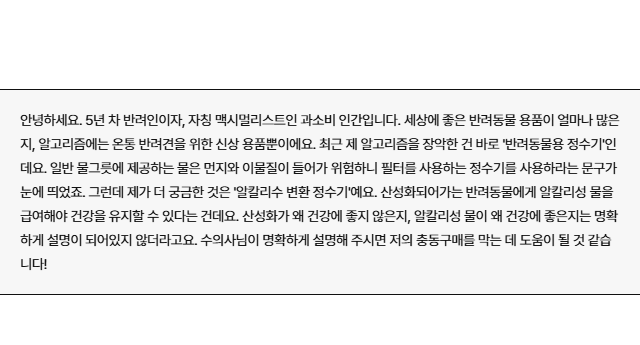 따라서, 알칼리성 물은 좋은 선택지가 되긴 하지만 무조건 필수는 아니며 어떤 아이에게는 독이 될 수도 있음을 꼭 명심하시길 바랍니다. 건강하고 어린 강아지에게는 정수기 물정도면 충분합니다. 이 글이 여러분의 슬기로운 반려 생활에 도움이 되길 바랍니다.