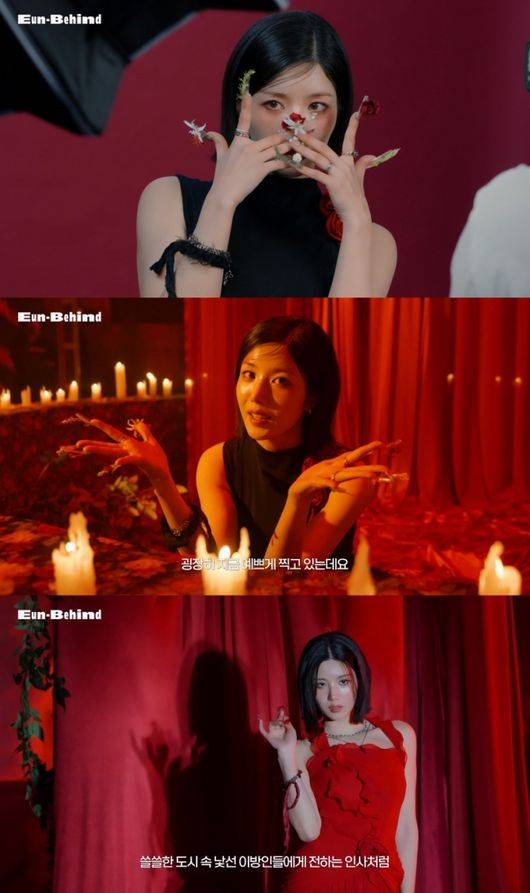 공개된 영상은 '헬로 스트레인저' 뮤직비디오, 재킷 등 다양한 촬영에 임하는 권은비의 모습과 인터뷰를 담고 있다. 그가 활활 타오르는 촛불로 둘러싸인 공간에 누워 붉은 천을 덮고 있는 장면을 비추며 시작돼 단번에 시선을 사로잡았다.