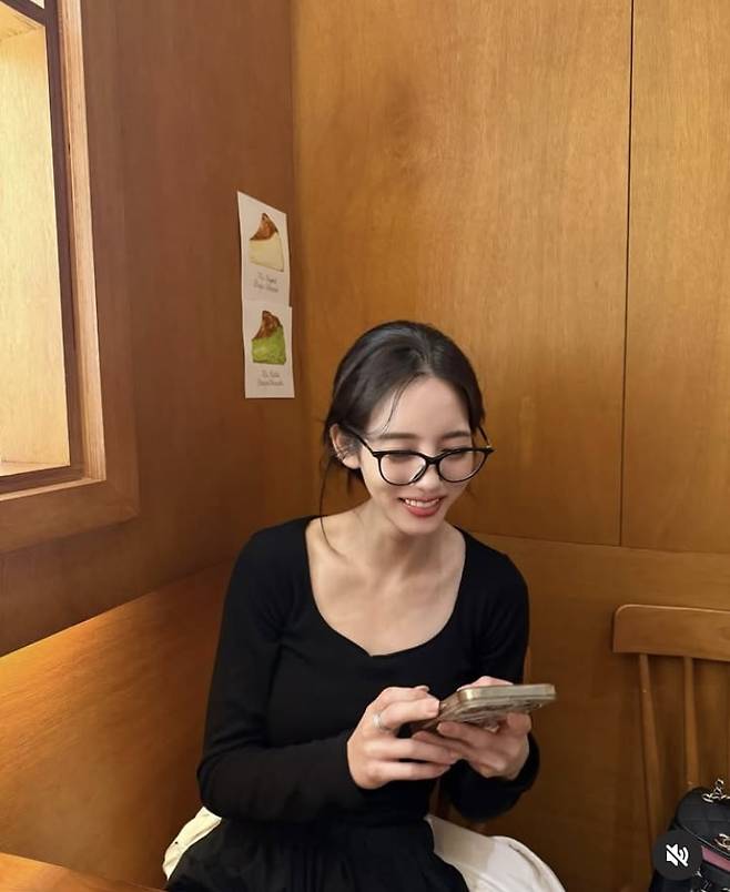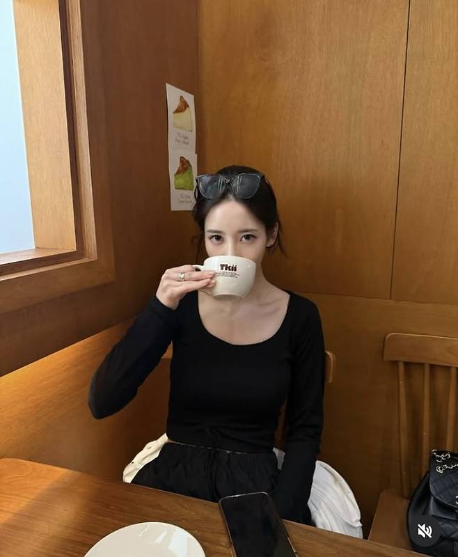 공개된 사진 속 한서희는 카페에서 커피를 마시는 모습. 올블랙 패션을 입고 멋을 냈다.