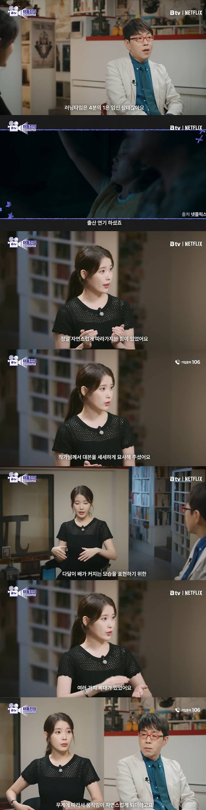 이동진은 "스타인 '아이유'하면 떠오르는 이미지가 있는데 어머니 연기도 종류별로 다했다. 러닝 타임 4분의 1은 임신 상태지 않나. 아이가 셋이다. 항상 허리르 짚는 연기를 하고 출산 연기도 했다. 아이 밥 먹이고 토닥이고 안고 우는 연기도 했다"고 짚었다.