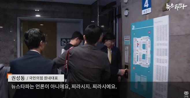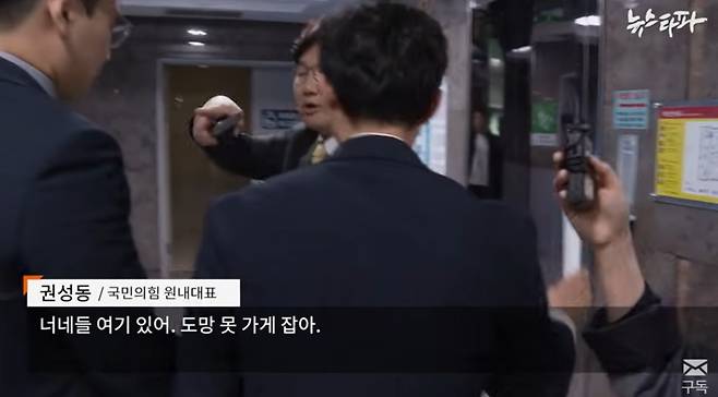 | ▲ 권성동 원내대표가 직원들에게 뉴스타파 기자를 "도망 못 가게 잡아"라고 지시하는 모습 |