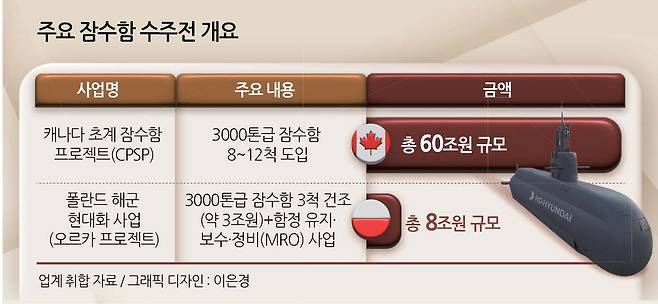 17일 방산업계에 따르면 두 회사는 현재 캐나다와 폴란드가 추진 중인 차세대 잠수함 도입 사업 수주전에 참여하고 있다. 두 업체는 2월 방위사업청 주도로 함정수출사업 원팀 구성을 위한 양해각서(MOU)를 체결하며 최대 60조원 규모의 캐나다 해군 잠수함 도입 사업(캐나다 초계 잠수함 프로젝트, CPSP)은 공동 대응할 방침이다.