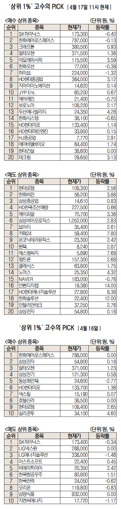 미래에셋증권에서 거래하는 고수익 투자자들이 17일 오전 가장 많이 순매수한 종목은 SK하이닉스(000660), 한화에어로스페이스(012450), 크래프톤(259960), 알테오젠(196170), 아모레퍼시픽(090430)인 것으로 집계됐다.