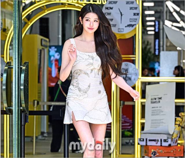 장원영은 달빛 풍경 패턴의 비즈 장식 보트네크라인 미니원피스를 입고 참석했다. 허리까지 내려오는 긴 웨이브 헤어에 CG 같은 비율로 등장과 동시에 현장의 팬들의 감탄사가 여기저기 터져 나왔다.