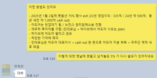 지난해 하이브는 어도어 감사를 통해 민희진의 오른팔로 불렸던 어도어의 전 부대표 A씨가 작성한 문건들을 확보했다.‘프로젝트 1945’와 ‘하이브 7대 죄악’ 문서 등이다. 논란이 된 ‘어도어를 빈껍데기로 만들고 하이브를 빠져나가기’등의 문구도 A씨가 작성한 것으로 알려진다.