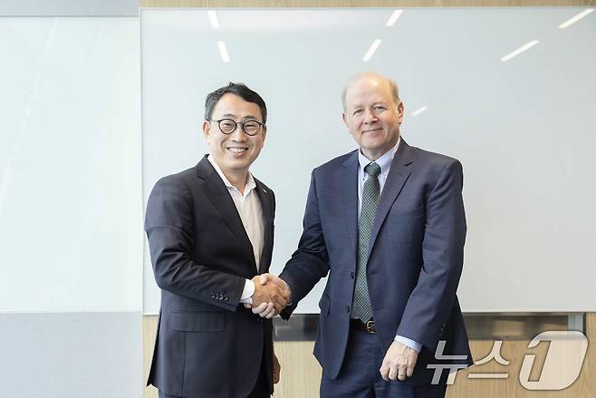 17일 서울 을지로 SKT 본사에서 유영상 SKT CEO와 피터 채프먼 IonQ 이사회 의장이 기념 촬영을 하고 있다. (SKT 제공. 재판매 및 DB 금지) 2025.4.17/뉴스1