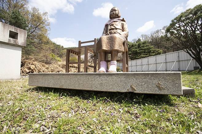 | ▲ 아산시는 지나 3월 중순 경, 신정호 주변 공사를 이유로 평화의 소녀상을 임의로 이동조치 했다. |