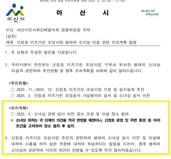 아산시는 공문에서 "신정호 키즈가든 조성사업 추진과 관련해 평화의 소녀상 임시 이전 및 이설에 대해 소통을 하지 않은 부분에 대해 죄송하다는 말씀을 드린다"라며 "향후 평화의 소녀상과 관련해 시민의 의견이 반영될 수 있도록 적극 협의하겠다"고 밝혔다.
