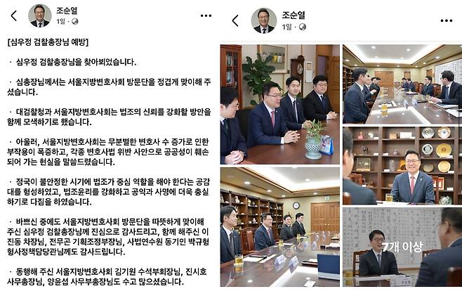 조순열 서울지방변호사회장은 지난 15일 "심우정 검찰총장님 예방"이란 제목의 글과 함께 본인을 비롯한 방문단과 심 총장이 면담하는 사진 여러 장을 페이스북에 올렸다. 조 회장은 이 글에서 "심 총장님께서는 서울지방변호사회 방문단을 정겹게 맞이해 주셨다"라며 "대검찰청과 서울지방변호사회는 법조의 신뢰를 강화할 방안을 함께 모색하기로 했다"라고 밝혔다.
