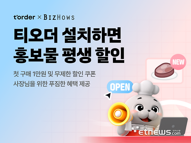 테이블오더 기업 티오더(대표 권성택)는 소상공인을 위한 맞춤형 홍보·판촉 커머스 '비즈하우스'와 외식업 자영업자를 위한 할인 프로모션을 진행한다고 밝혔다.