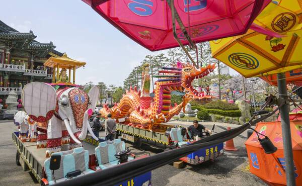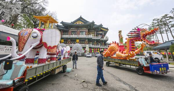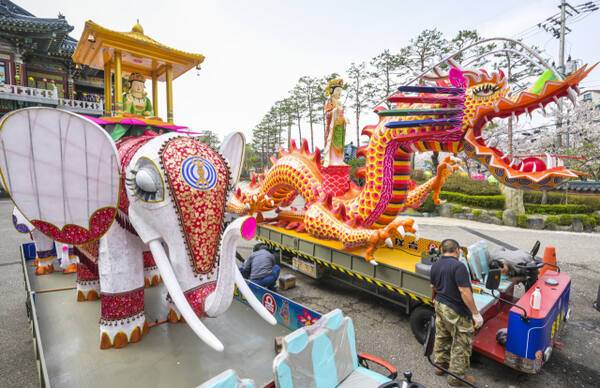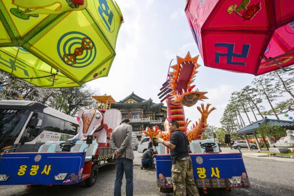 2025 수원연등축제를 이틀 앞둔 17일 오전 수원특례시 장안구 대한불교천태종 용광사에서 관계자들이 축제 때 사용할 대형 조형을 점검하고 있다. 2025 수원연등축제는 오는 19일 진행될 예정이다. 불교에서 연등은 불을 밝힘으로써 어두운 세계를 밝게 비춰주는 부처님의 공덕을 칭송하고 깨달음의 세계에 이르고자함에 있다고 한다.