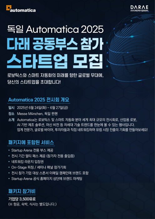 다래전략사업화센터가 유럽 최대 자동화·로봇 전문 전시회인 'Automatica 2025'에 참가할 국내 스타트업 5개사를 선착순으로 모집한다고 밝혔다.