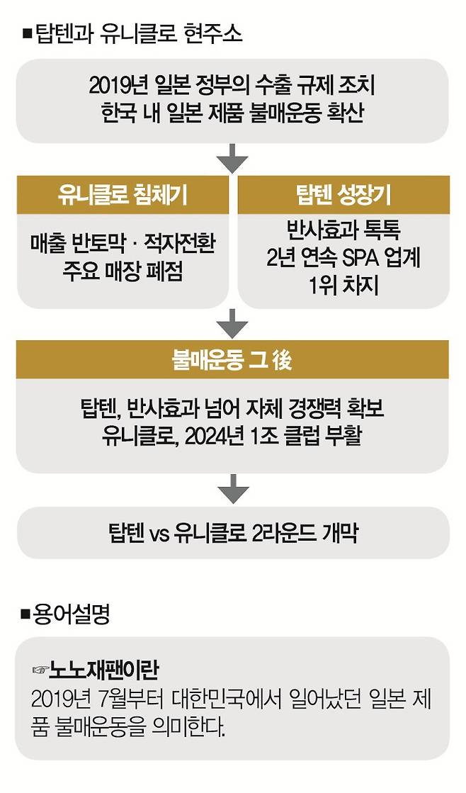 '노노재팬'이 들불처럼 일어난 기간, 탑텐은 국내 SPA 시장의 1위로 올라섰다. 2021년 매출액 5850억원을 기록해 유니클로(5824억원)를 처음 따돌렸고, 기세는 2022년까지 이어졌다.