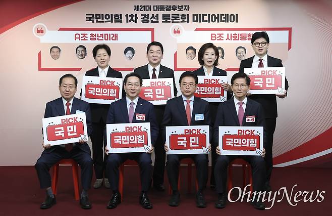 | ▲ 국민의힘 대선 경선 후보자들이 17일 오전 서울 영등포구 여의도 중앙당사에서 열린 제21대 대통령후보자 국민의힘 1차 경선 토론회 미디어데이에서 피켓을 들고 기념촬영을 하고 있다. 앞줄 왼쪽부터 홍준표 전 대구시장, 유정복 인천시장, 이철우 경북도지사, 김문수 전 고용노동부 장관. 뒷줄 왼쪽부터 양향자 전 의원, 안철수 의원, 나경원 의원, 한동훈 전 대표. |