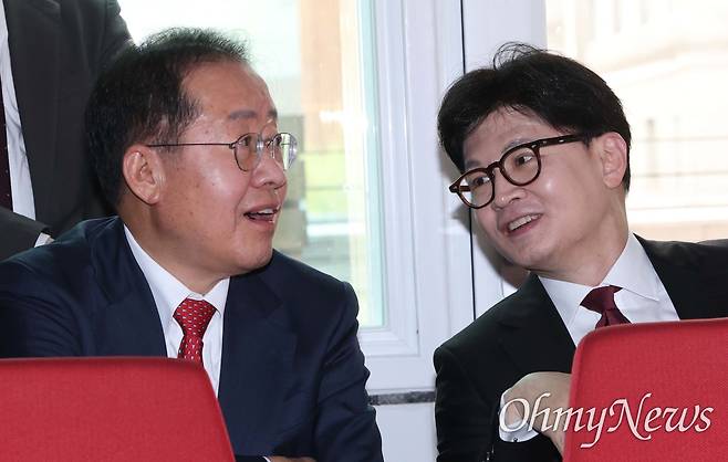 | ▲ 홍준표 전 대구시장과 한동훈 전 대표가 17일 오전 서울 영등포구 여의도 중앙당사에서 열린 제21대 대통령후보자 국민의힘 1차 경선 토론회 미디어데이에서 대화를 나누고 있다. |