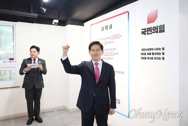 | ▲ 17일 서울 여의도 국민의힘 중앙당사에서 열린 제21대 대통령선거 국민의힘 1차 경선 토론회 미디어데이에서 김문수 경선 후보가 후보서약서에 서명한뒤 기념촬영을 하고 있다. |