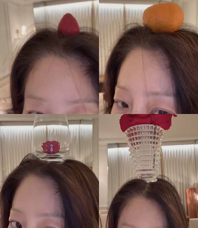 공개된 사진 속 고현정은 정수리 위에 딸기 한 알을 올려둔 모습.