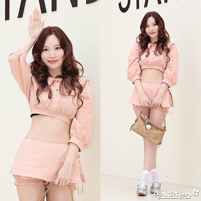 이날 나연은 핑크 컬러의 크롭 셔츠와 미니 스커트 셋업으로 시선을 사로잡았다. 볼륨감 있는 퍼프 소매와 러플 디테일이 어우러진 상의는 그녀의 러블리한 매력을 배가시켰고, 허리 라인을 드러낸 크롭 스타일로 스타일리시한 감각을 드러냈다.