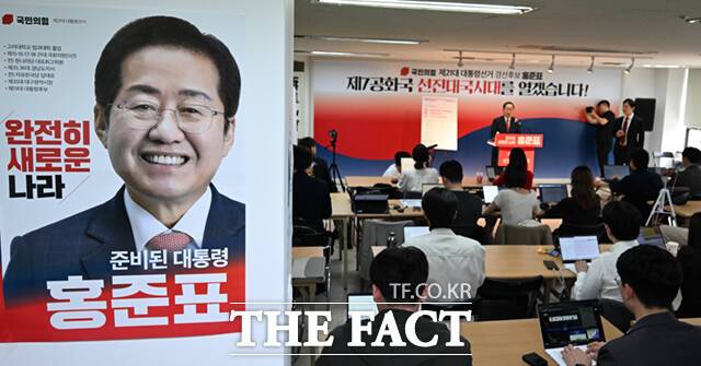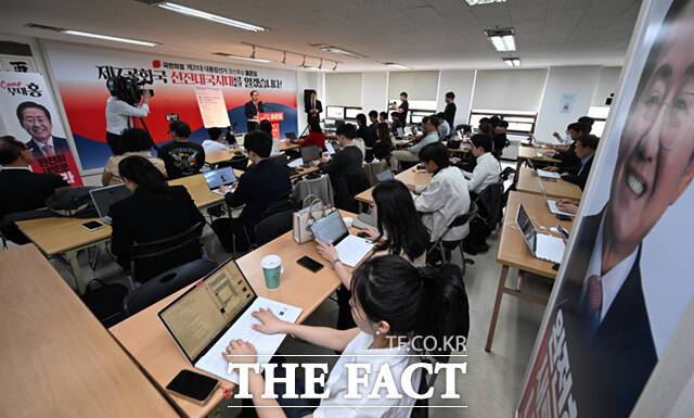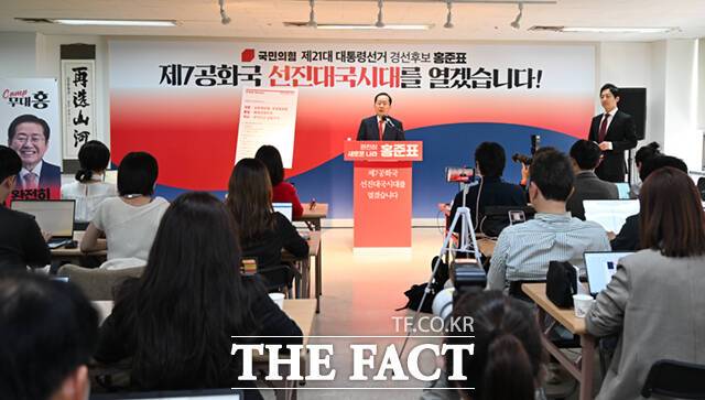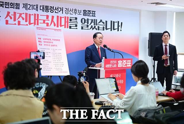 [더팩트ㅣ이새롬 기자] 홍준표 국민의힘 대선 경선 후보가 17일 오후 서울 여의도 선거캠프에서 국방·통일·외교 분야 비전 발표를 하고 있다.