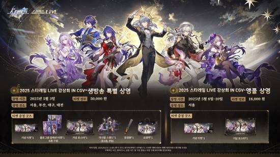 '붕괴: 스타레일' 2주년 기념 콘서트 생방송 특별 상영은 5월 3일 오후 8시에 시작되며, 관람 가능한 CGV 지점은 용산아이파크몰, 연남, 서면, 대전터미널, 대구아카데미 등 총 5곳이다.