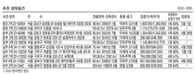 성남 분당구 이매동 132 아름마을 아파트 301동 1002호가 경매로 나왔다. 8개동 414가구의 아파트 단지로 1992년 11월에 입주했다. 17층 건물 중 10층으로 남향이며 134.8㎡(49평형) 3베이 구조로 방이 4개다. 감정가 12억6000만원에서 한 차례 떨어져 8억8200만원에 매각이 진행된다. 시세는 14억5000만원에서 16억원에 거래되고 있으며 전세가는 6억5000만원에서 7억5000만원 선이다. 매각 일자는 5월 2일 성남지원 경매 1계다. 사건번호 23-57390