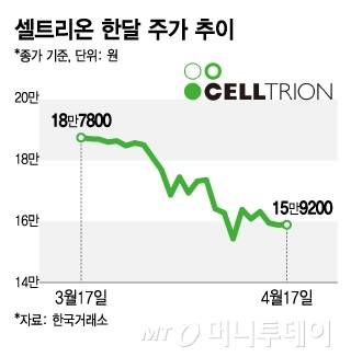 17일 한국거래소에 따르면 셀트리온의 주가는 지난 한 달 간 18만7800(3월17일 종가)에서 15만9200원(4월17일 종가)으로 내리며 15.23% 하락했다.
