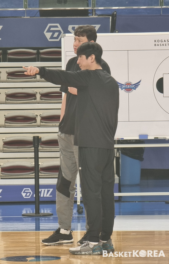 한국가스공사가 변형 지역방어를 설 때, 송영진 KT 감독은 선수들에게 대형과 움직이는 방법을 알려줬다.