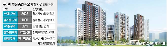정부가 2023년 발표한 공공택지 중 한 곳인 ‘토평2구역’(약 1만8500가구)도 구리 전세 거주자가 청약을 노리는 곳이다. 한강 조망이 가능하고 분양가상한제가 적용돼 청약 열기가 뜨거울 것으로 전망된다. 사전청약은 2027년 상반기로 예정돼 있다. 윤지해 부동산R114 수석연구원은 “재개발 구역이 순항하고 있어 향후 지역 가치가 재평가될 것”이라고 말했다.