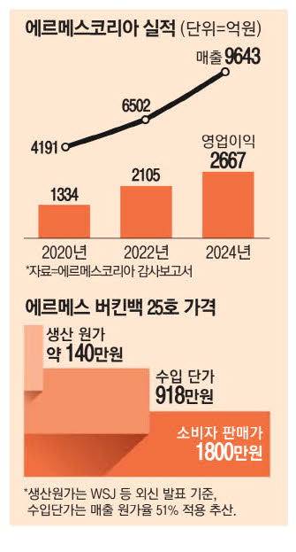 에르메스코리아가 프랑스 본사에서 해당 제품을 수입해올 땐 관세와 별도 마케팅 비용 등이 따라붙는다. 여기에 인건비를 붙여 한국 내 판매가격이 정해지는 구조다. 금융감독원 전자공시(감사보고서)에 따르면 관세와 인건비 등을 포함한 에르메스의 한국 내 매출원가율(매출액에서 매출원가가 차지하는 비중)은 51.7%다. 루이비통코리아와 샤넬코리아 매출원가율은 각각 57.6%, 52.4%다. 명품 3인방으로 꼽히는 '에루샤(에르메스·루이비통·샤넬)' 중 에르메스가 가장 수익성이 좋다는 뜻이다.