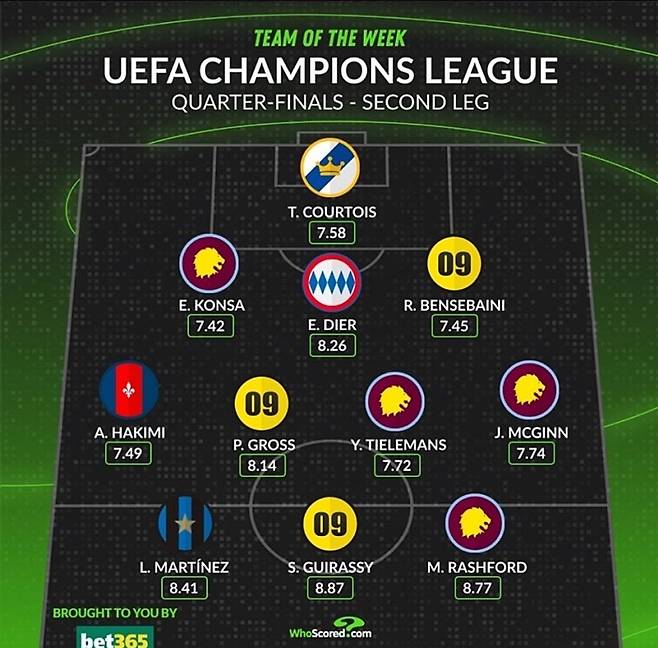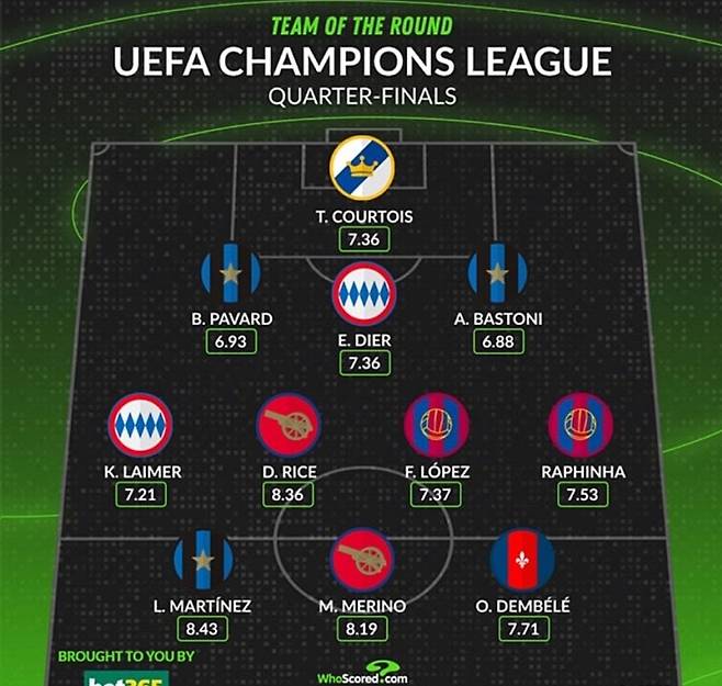 축구통계매체 '후스코어드닷컴'은 17일(한국시간) 2024-2025 UEFA 챔피언스리그 8강 2차전, 그리고 8강 1~2차전 전체에 대한 베스트11을 연달아 발표했다. 다이어는 두 곳에 모두 들어갔다.