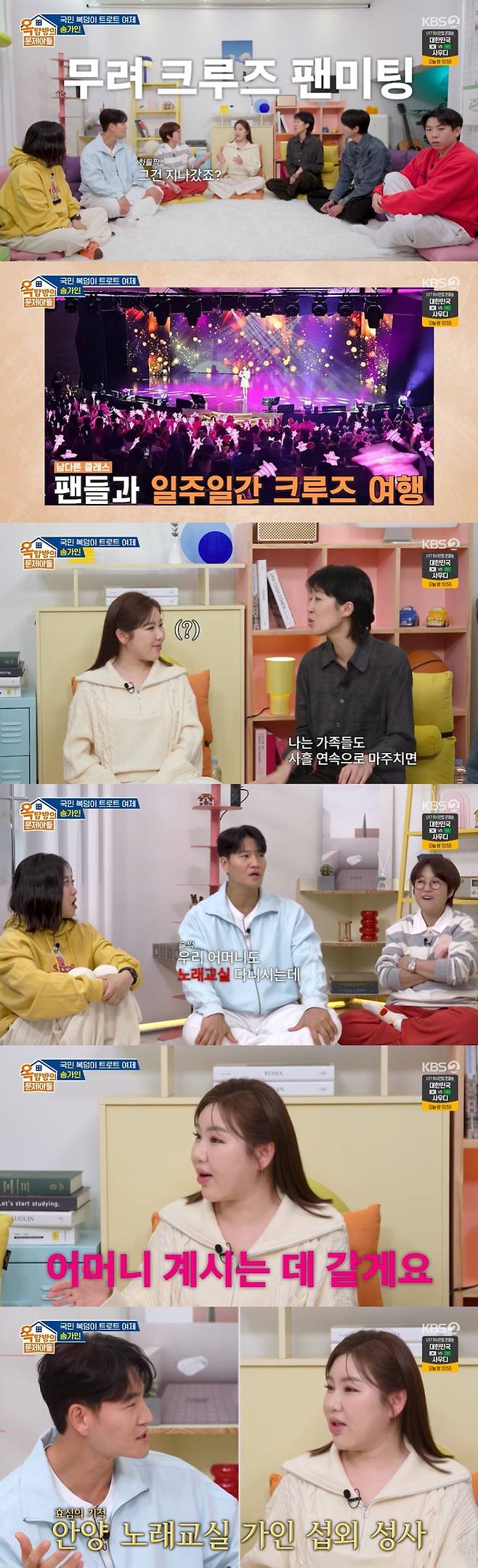 김숙이 "그 배 안에서 계속 가인 씨랑 있는 거냐"고 묻자 송가인은 "같이 여행하고, 관광하고, 밥도 먹고"라며 크루즈 팬미팅 일정을 공유했다.