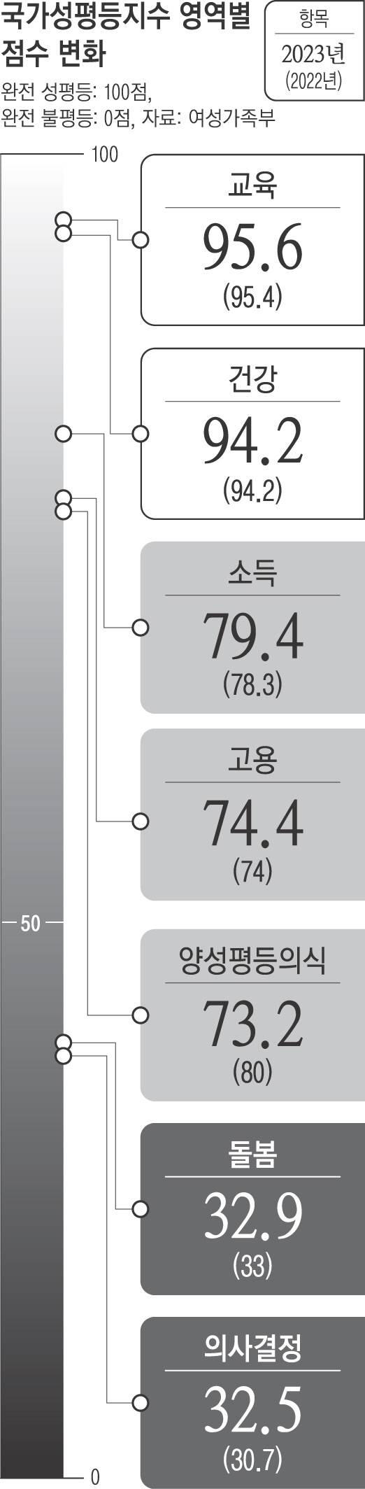 세부 영역별로 의사결정·고용·소득·교육 등 영역에선 점수가 상승했으나 양성평등의식과 돌봄 영역에서 하락했다. 교육(95.6점), 건강(94.2점) 영역의 성평등 수준은 높은 편인 반면 의사결정(32.5점), 돌봄(32.9점)은 30점대에 그쳤다.