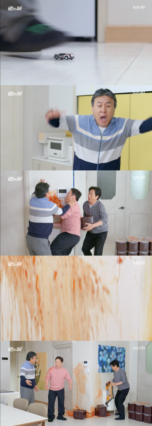 17일 전파를 탄 KBS 2TV 수목시트콤 '빌런의 나라'에서는 장난감을 밟은 오영규(박영규 분)가 넘어지면서 김치통을 엎었다.