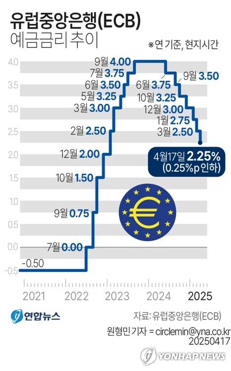 (서울=연합뉴스) 원형민 기자 = 유럽중앙은행(ECB)은 17일(현지시간) 독일 프랑크푸르트에서 통화정책이사회를 열어 예금금리를 연 2.50%에서 2.25%로, 기준금리를 연 2.65%에서 2.40%로 각각 내렸다고 밝혔다.