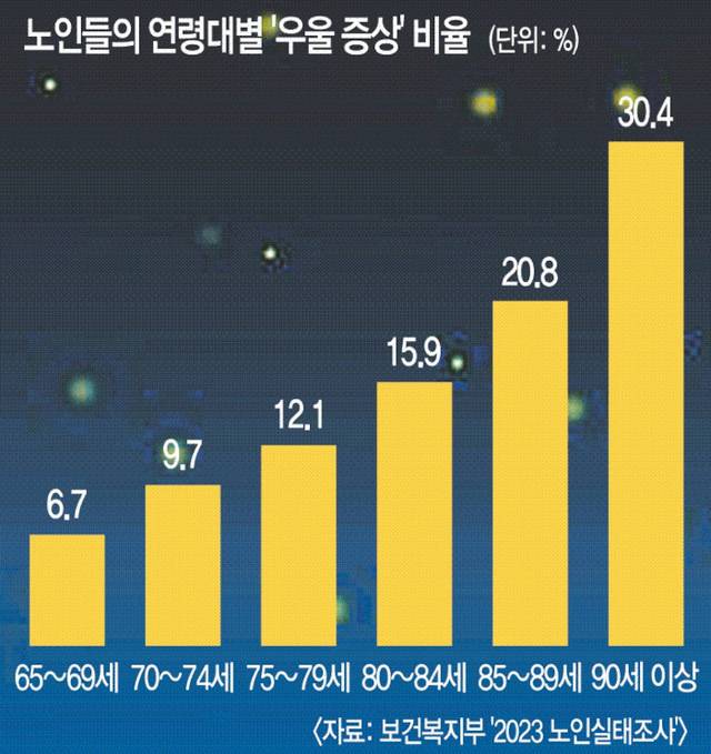 보건복지부와 한국보건사회연구원이 지난해 10월 발표한 ‘2023 노인실태조사’에 따르면 65세 이상 노인 중 우울 증상을 보이는 비율은 10명 중 1명꼴인 11.3%였다. 특히 연령대가 높을수록 우울 증상을 호소하는 비율이 높았다.