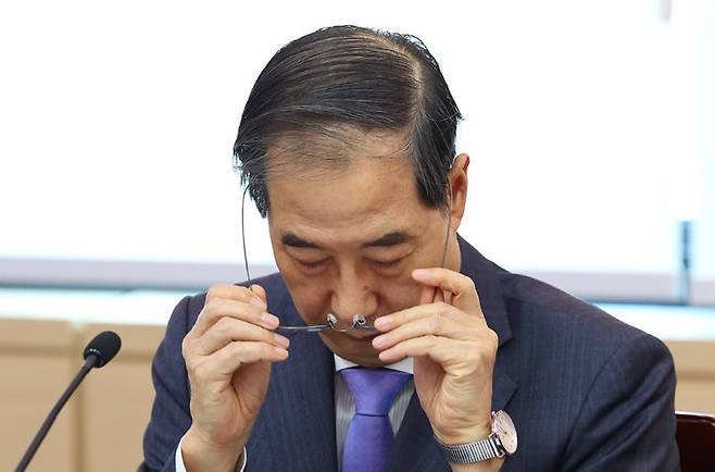 고심 한덕수 대통령 권한대행 국무총리가 17일 정부서울청사에서 열린 아시아태평양경제협력체(APEC) 정상회의 준비위원회에서 안경을 벗고 있다. 국민의힘 일부 의원들이 한 권한대행의 차출론을 띄우는 가운데 이날 공개된 전국지표조사(NBS)에서는 한 권한대행의 대선 출마가 ‘바람직하지 않다’(66%)는 답변이 ‘바람직하다’(24%)보다 높았다. 뉴시스