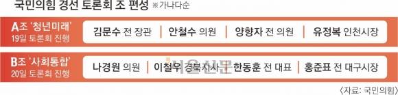 조 편성이 끝난 후보들은 18일 후보자 비전 대회에 참석한다. A조와 B조의 토론회는 19, 20일 오후 2시에 각각 열리며 21~22일 100% 일반국민 여론조사가 진행된다. 이를 종합해 오는 22일 저녁 경선 진출자 4인이 발표된다.