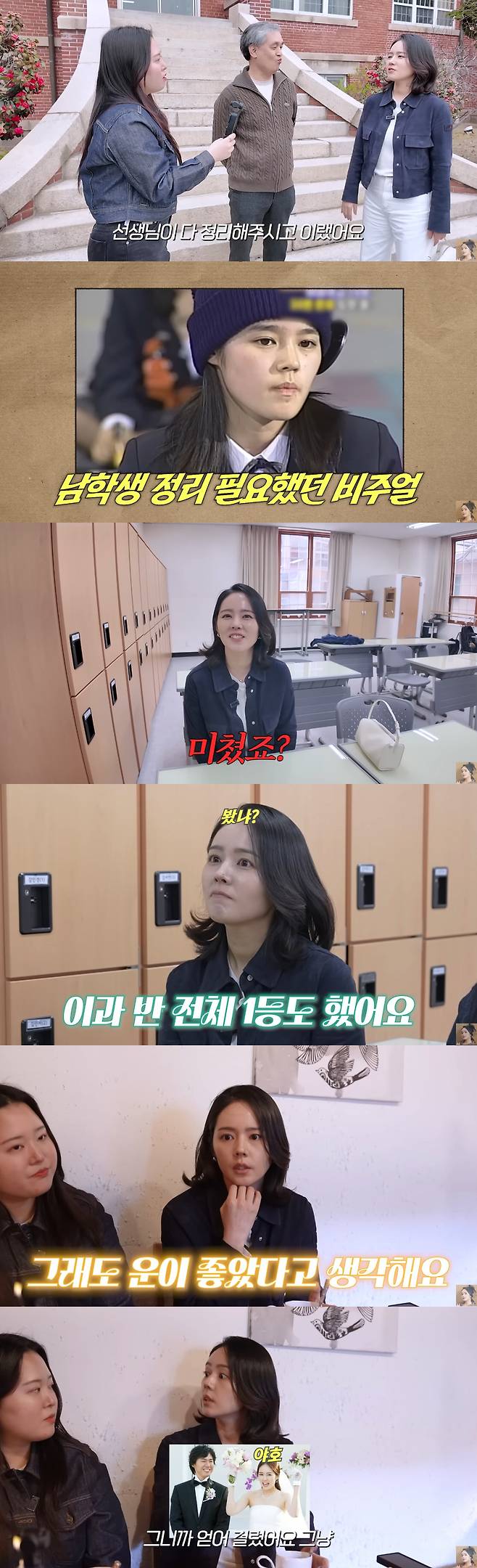 고3 때 교실을 찾은 한가인은 과거 뉴스 인터뷰를 떠올리며 "고교 평준화하는데 어떻게 생각하냐고 해서 나는 더 어려운 문제도 풀 수 있는데 나만 공부하는 게 아니라 다른 친구들 수준도 생각해야 된다는 얘기를 했다. 미쳤다"며 헛웃음을 터뜨렸다.