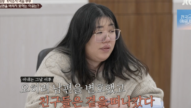 아내는 “남편 때문에 주변 사람도 다 떠났다”라며 친구들과 첫 만남에 무례한 모습을 보였다고. 만취해 계단에서 아내까지 밀쳤다는 것. 그런 폭력적인 남편을 감싸다 친구들이 떠난 것이다. 심지어 눈 때문에 퇴근 라이딩을 못해주는 아내에게 오히려 욕설 섞인 투정을 부른 남편. 위험한 눈 운전을 하게 된 아내는 남편의 무시와 폭언 속에 있었다. 그러면서 아내는 “죽고싶은 적 있다”고 말하기도 했다.하지만 남편을 못 떠나는 아내는 “나 아니면 얘 누가 받아주겠나”라며 자신을 희상하고 있었다. 남편의 친구들이 없다는 것.