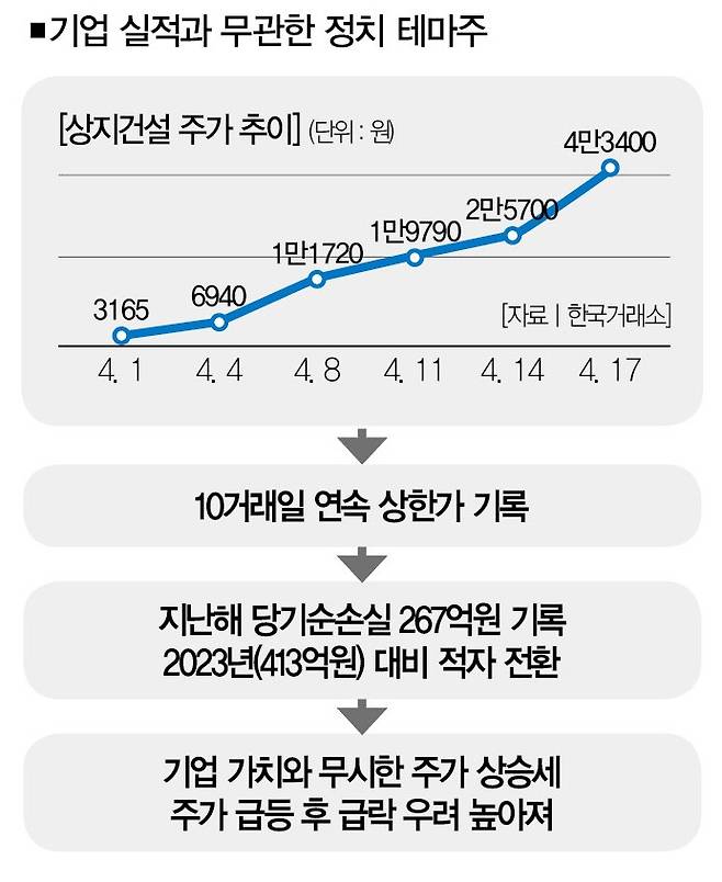 주목할 점은 이런 와중에도 상한가를 기록한 종목이 적지 않았단 점이다. 경남스틸, 꿈비, 에르코스, 상지건설, 태양금속 우선주, 평화홀딩스 등 17개 종목이었는데, 이중 13개 종목이 '정치 테마주'였다.