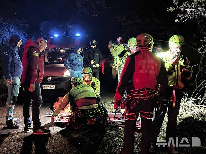 [카스텔람마레 디스타비아=AP/뉴시스] 17일(현지 시간) 이탈리아 남부 나폴리 인근 카스텔람마레 디스타비아 케이블카 추락 현장에서 구조대가 구조 준비를 하고 있다. 현지 당국은 높이 1100m의 파이토산 정상까지 운항하는 케이블카가 운행 도중 추락해 최소 4명이 숨지고 1명이 다쳤다고 밝혔다. 케이블카는 케이블이 끊어지면서 추락한 것으로 전해졌다. 2025.04.18.