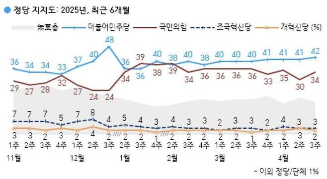 정당 지지도는 민주당 42%, 국민의힘 34%, 조국혁신당 3%, 개혁신당 2%였다. 지지 정당이 없는 무당(無黨)층은 18%로 집계됐다.