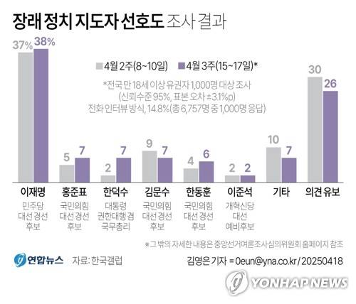 한국갤럽은 지난 15~17일 전국 만 18세 이상 유권자 1천명을 대상으로 조사(95% 신뢰수준에 표본오차 ±3.1%포인트)한 결과 민주당 이재명 후보가 38%, 국민의힘 홍준표 대선 경선 후보, 한덕수 대통령 권한대행 국무총리, 국민의힘 김문수 대선 경선 후보가 각각 7%로 집계됐다고 밝혔다.