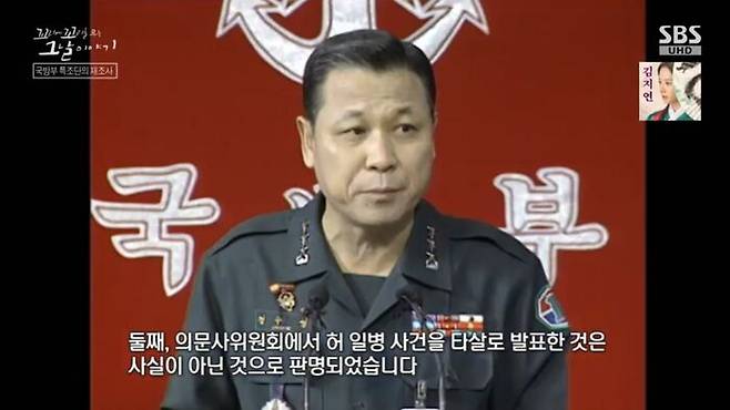 "조사 결과. 첫째. 허원근 일병은 자살하였습니다. 둘째 의문사위원회에서 허일병 사건을 타살로 발표한 것은 사실이 아닌 것으로 판명되었습니다."