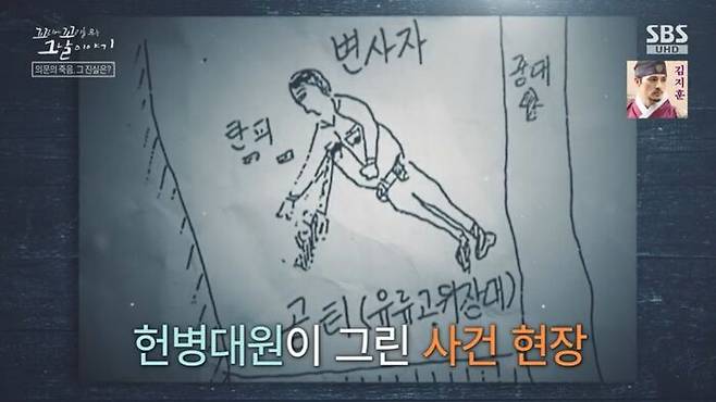 헌병대원이 사건현장을 그린 그림이야. 허 일병의 시신에 남은 총상이 세 군데야. 세 발을 쐈다면 탄피도 세 개가 있어야 하잖아. 하지만 이 그림에는 허 일병의 시신 옆에 탄피가 두 개 그려져 있어. 다른 헌병대원이 그린 그림에도 탄피는 두 개야.