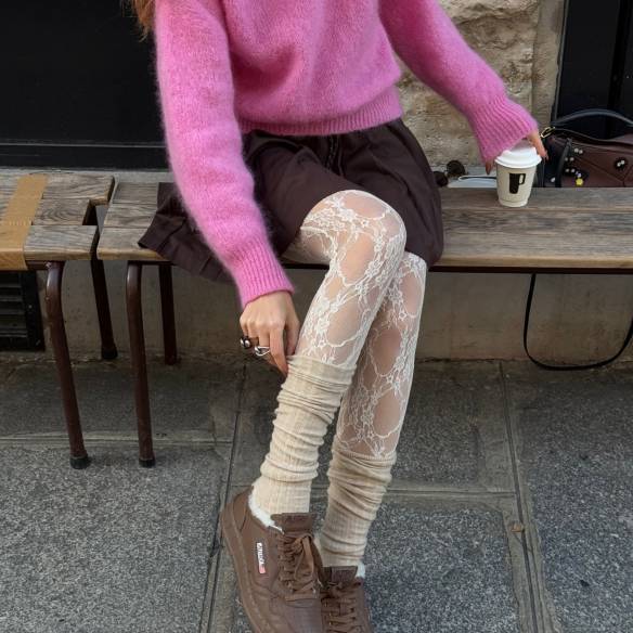 패션 인플루언서 샤샤 의 하얀 스타킹 스타일링은 아주 특별합니다. 플리츠 스커트 아래 꽃문양이 잔잔하게 들어간 바로크 스타일의 하양 스타킹을 신고 니삭스를 덧신어 귀여운 주름을 만들었거든요. 스커트와 슈즈 컬러 톤을 통일한 센스를 눈여겨보세요.
