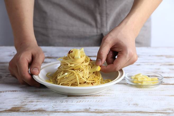 6. 비벼놓은 스파게티에 레몬 슬라이스로 장식해준다.