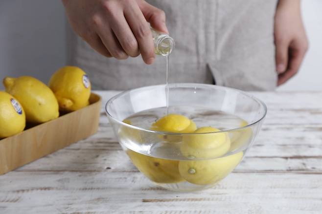 1. 레몬은 식촛물에 5분 동안 담가 뒀다가 흐르는 물에 깨끗이 씻어 준다.