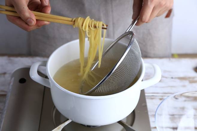 3. 냄비에 물을 넣고 끓어오르면 스파게티 면을 7분 동안 삶은 뒤, 체에 받쳐둔다.